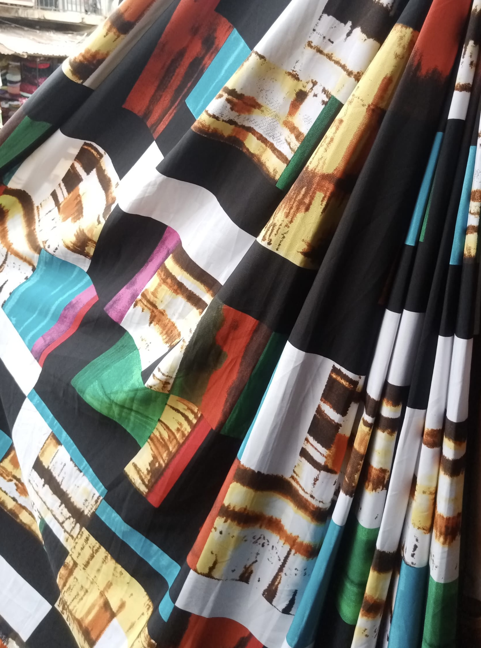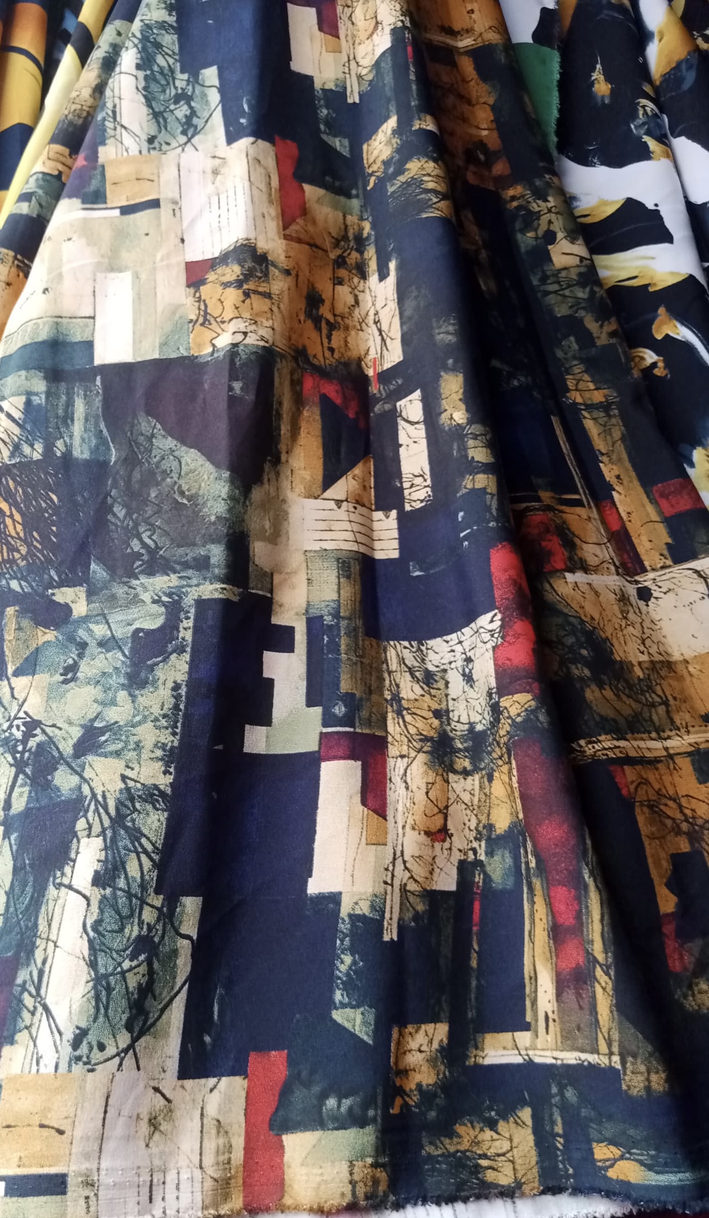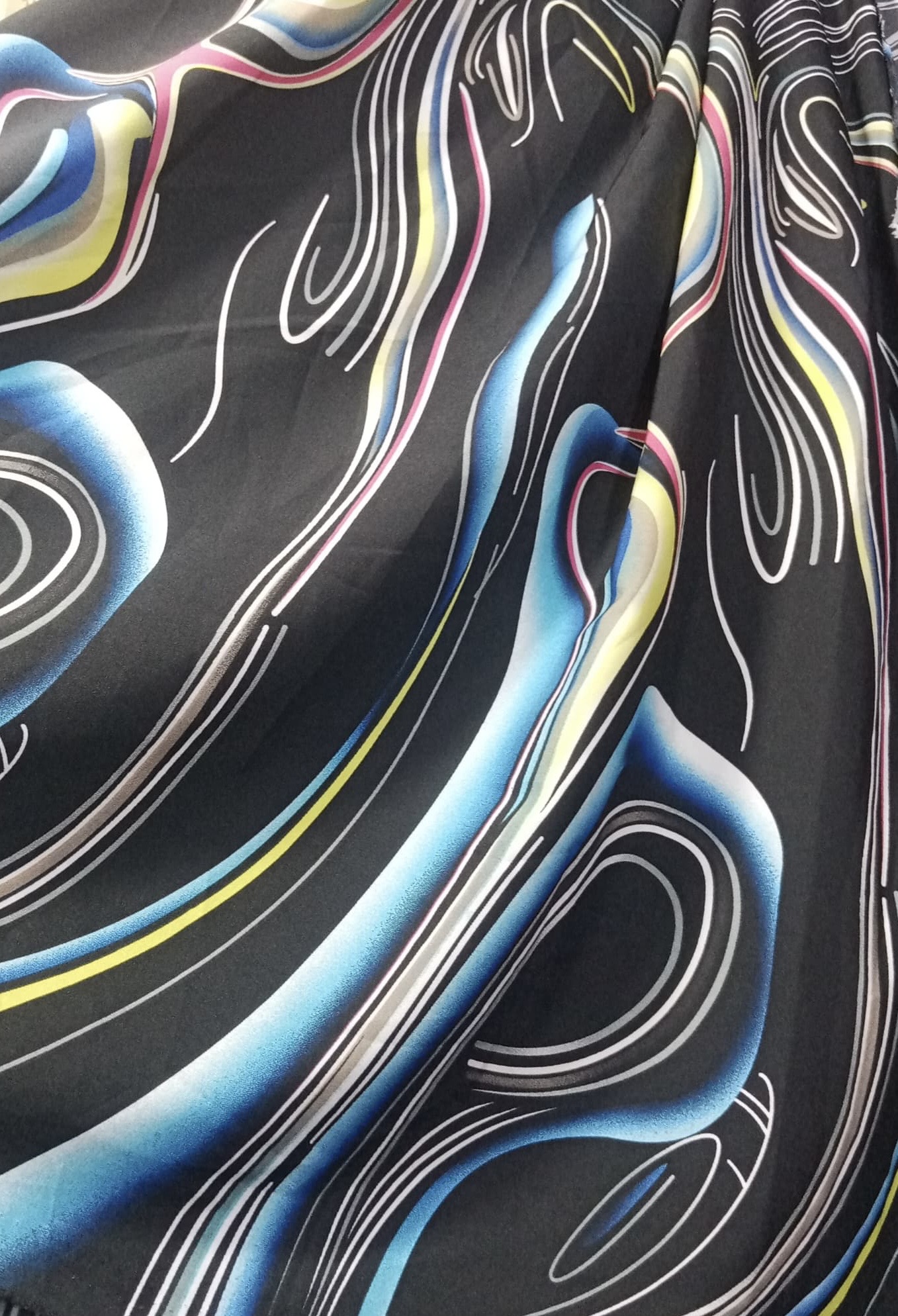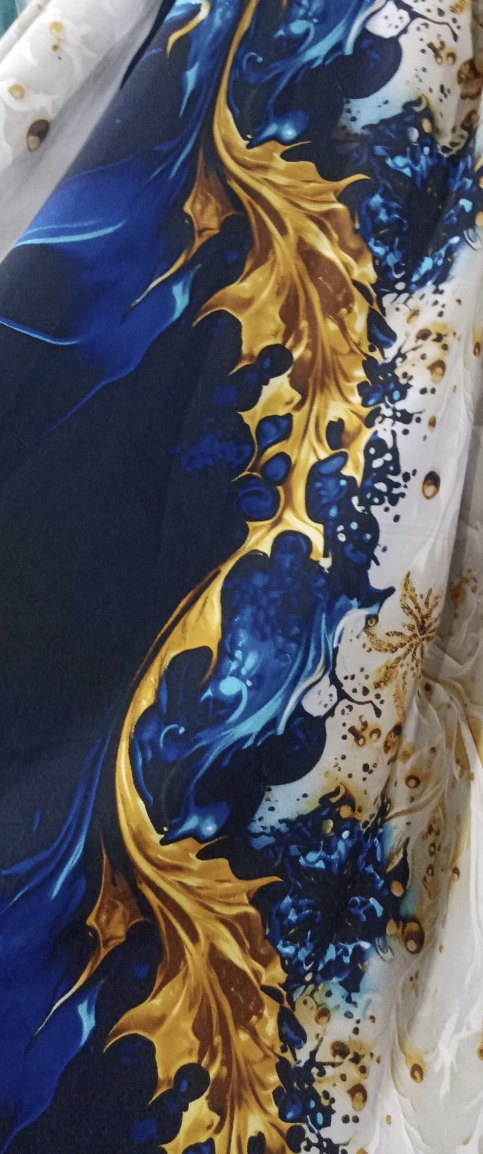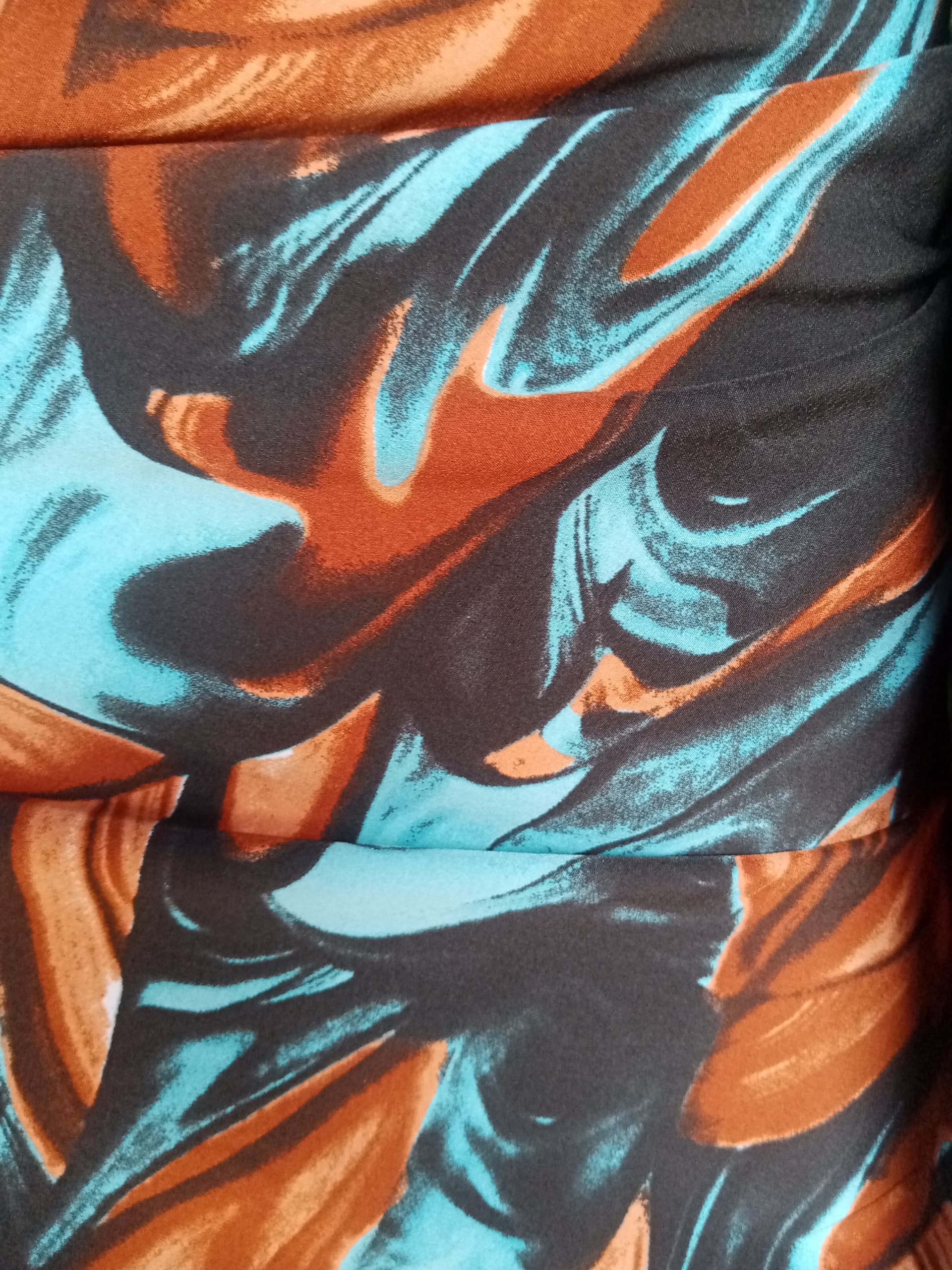 • Design: A button-down, longline jacket that can be worn open or closed for versatile styling. The jacket features a vibrant abstract floral swirl pattern in shades of teal, gold, and navy.