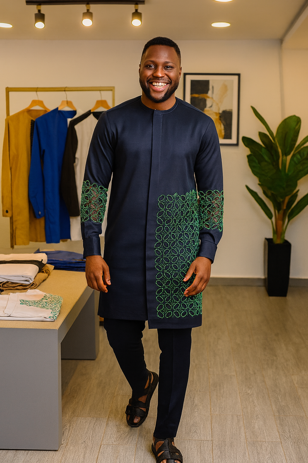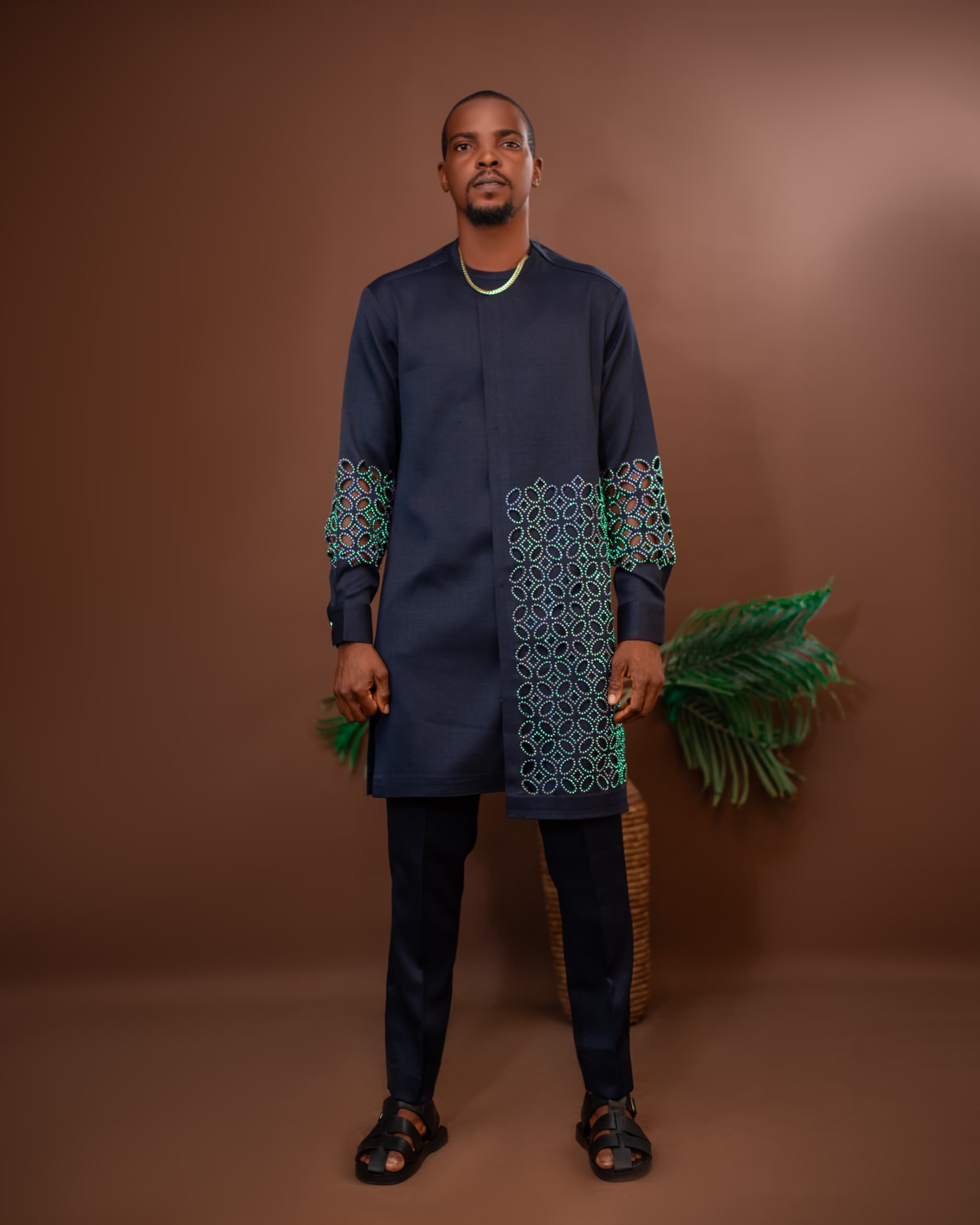 Step out in style with this elegant African senator wear, tailored from high-quality Irish material fabric and finished with intricate stone patterns green embroidery. This 2-piece set (top & pants) is a modern take on traditional menswear, perfect for weddings, engagements, cultural events, church, or stylish casual outings.