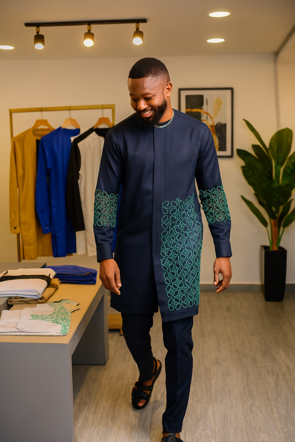 • Trousers: Slim-fit matching navy blue pants with a clean, tailored cut.