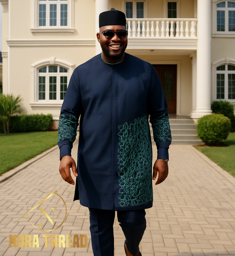 Embroidered Navy Blue African Senator Wear: Custom Made Kaftan Outfit