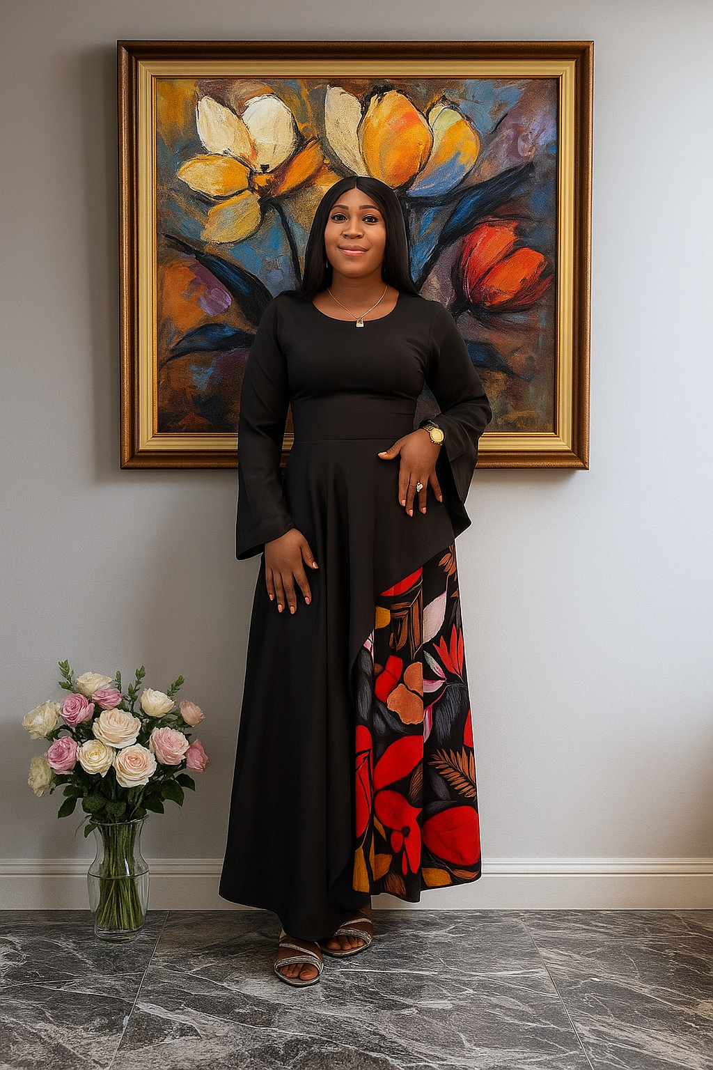 The African Maxi Down is a stunning fusion of contemporary fashion and African tradition. Crafted with a solid black bodice that flatters every figure, this dress features elegant bell sleeves and a slightly peplum waist for added sophistication. The flowing maxi skirt is brought to life with vibrant Ankara prints in red, gold, and earthy tones – celebrating African culture with a modern twist. Perfect for weddings, church services, cultural events, and evening outings.