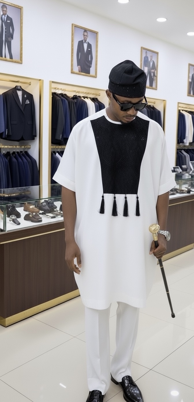 The standout feature is the embroidered black chest panel, adorned with delicate tassel details, adding a bold yet refined contrast to the rich mustard-gold fabric. The design represents strength, royalty, and modern African pride — perfect for weddings, engagements, celebrations, and cultural events.