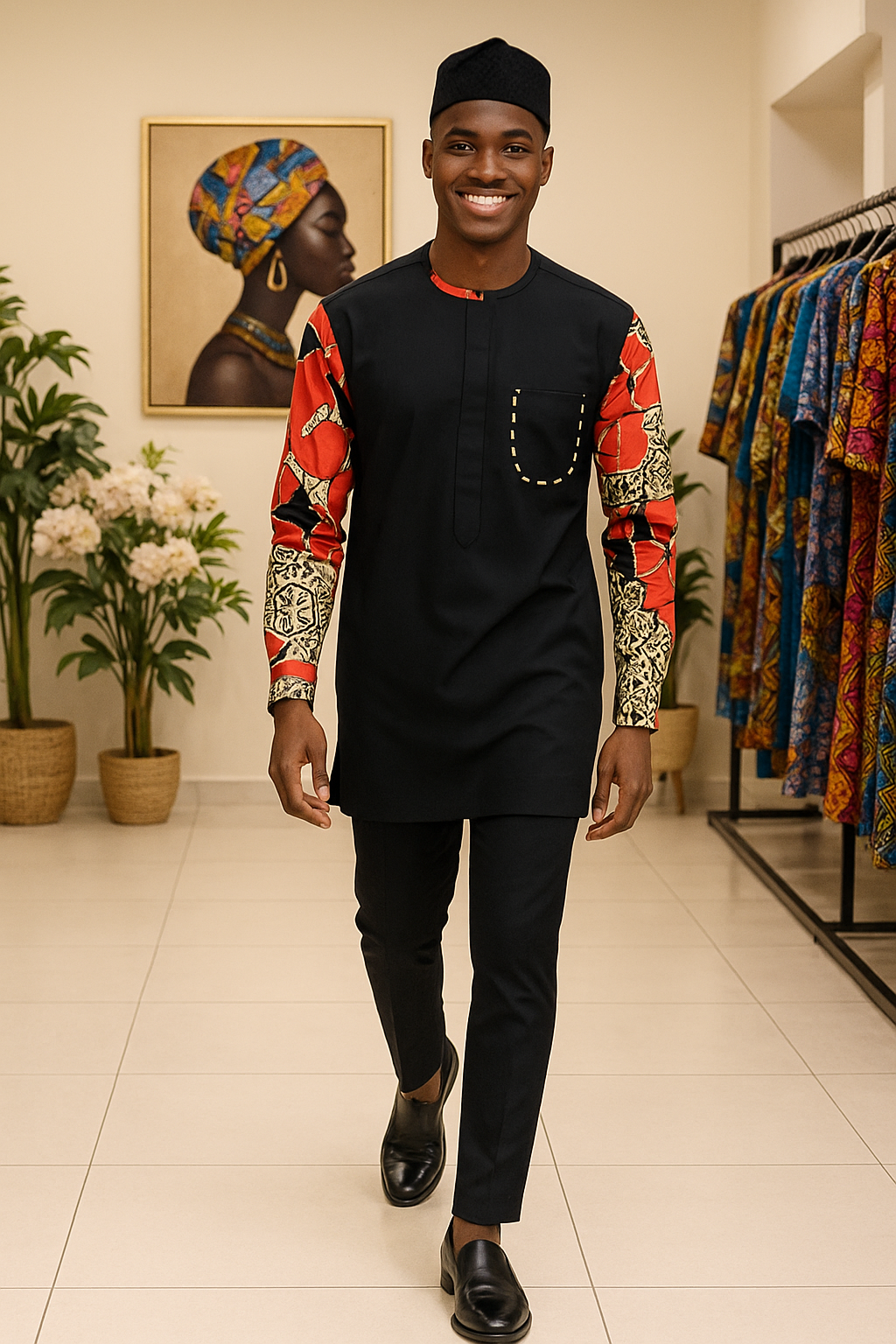 This outfit features a sleek longline black kaftan top with bold Ankara print sleeves in red, cream, and black, creating a vibrant contrast. The front is finished with a subtle neckline slit, side slits for movement, and a matching Ankara-trimmed chest pocket detail. Paired with tailored black pants, this set is perfect for weddings, parties, cultural events, church services, or stylish casual outings.