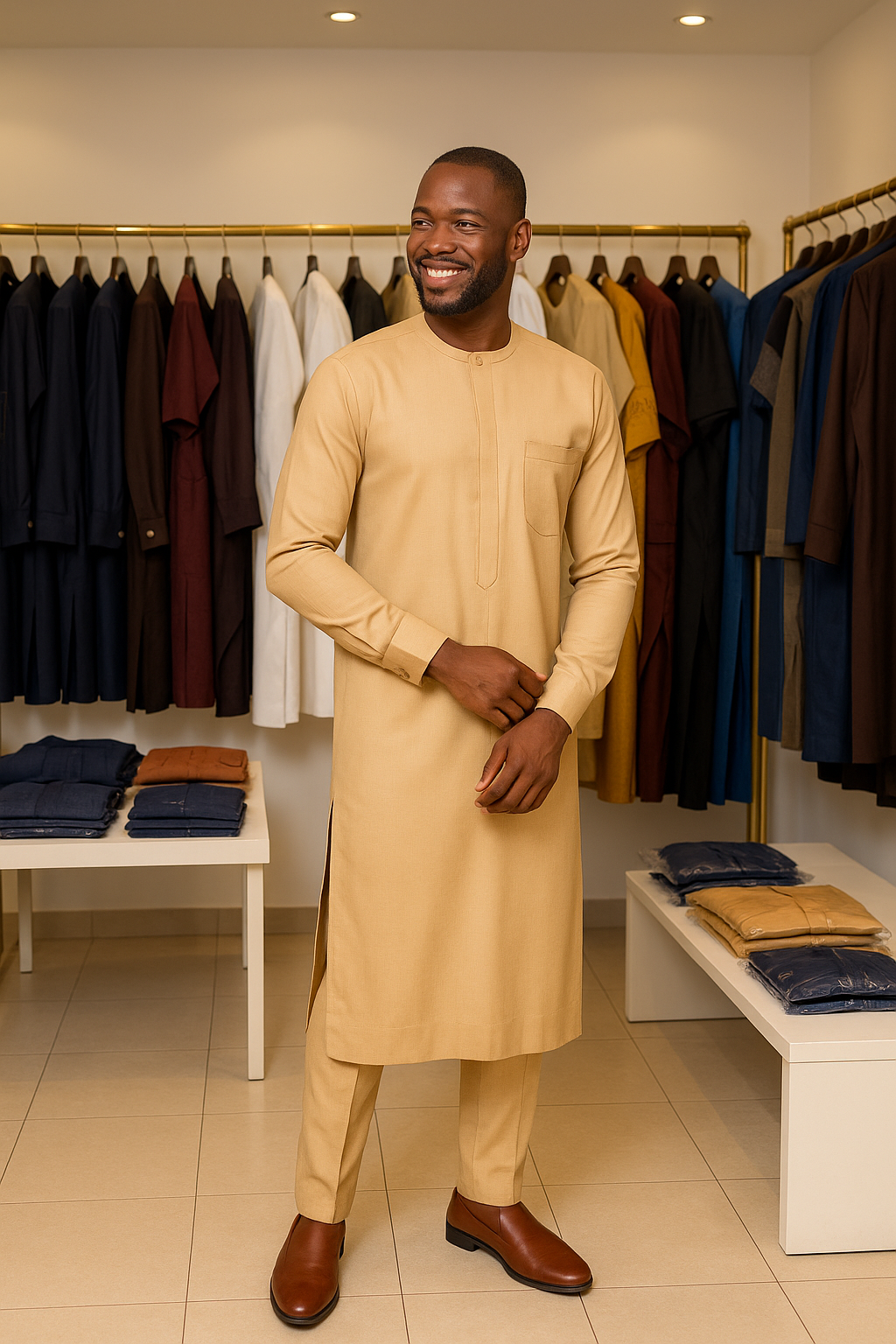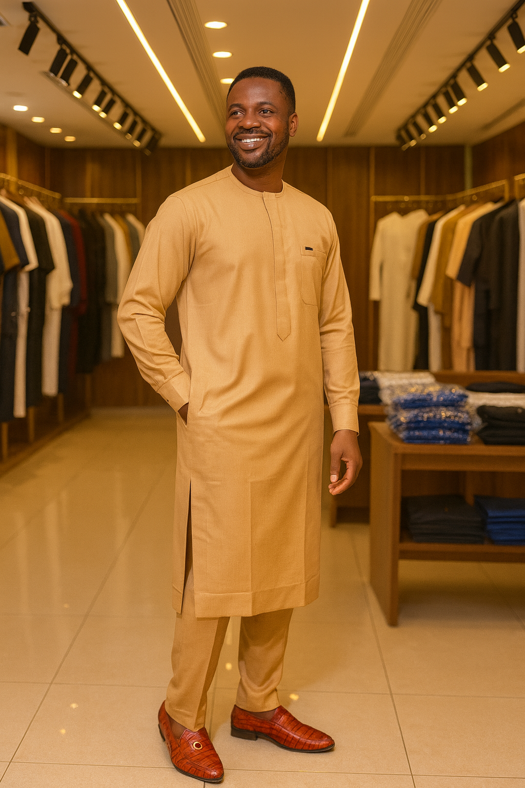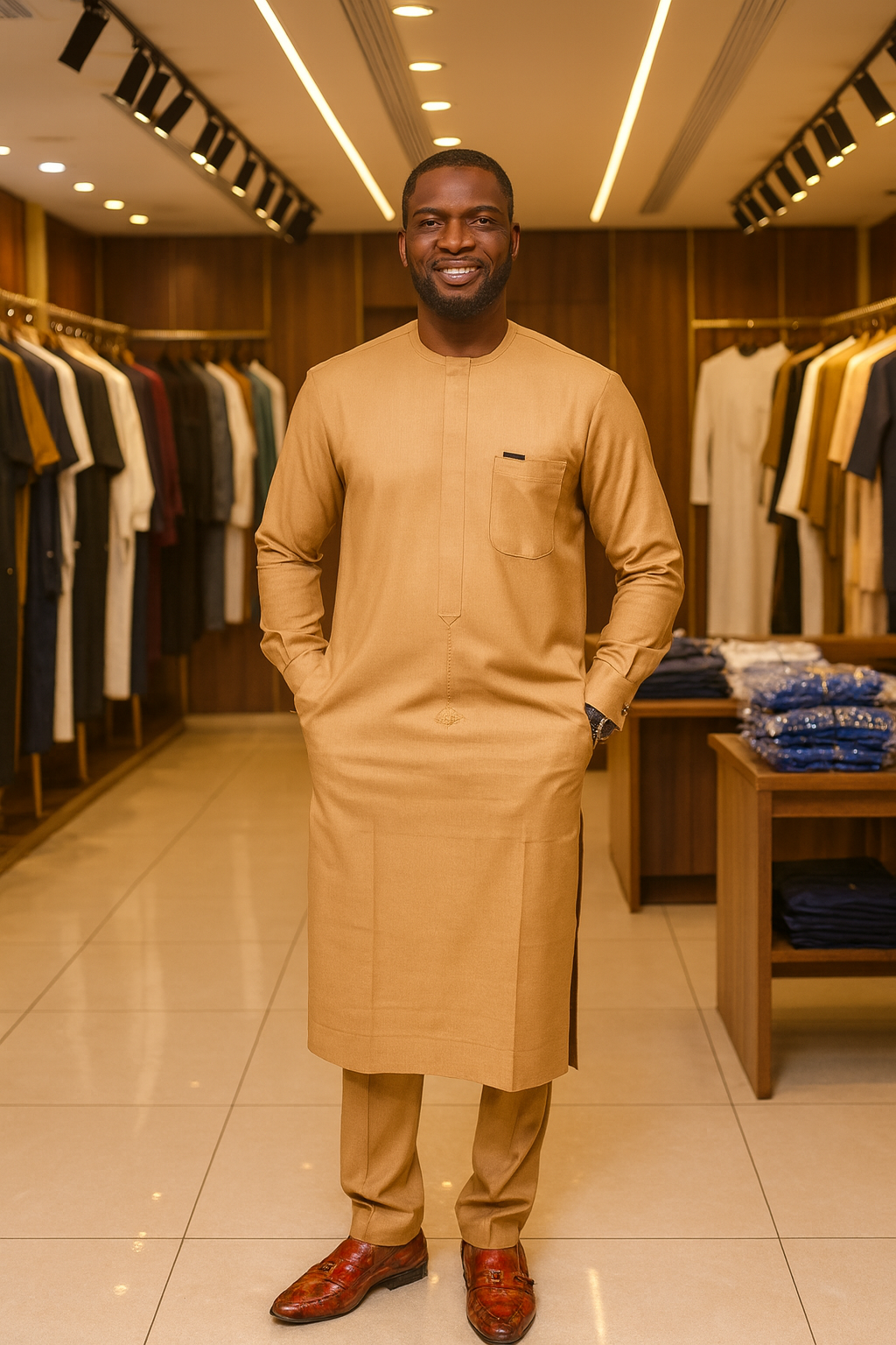 Inspired by the distinguished “Senator” style popular in Nigeria and across West Africa, this outfit exudes confidence and class. The ensemble features: