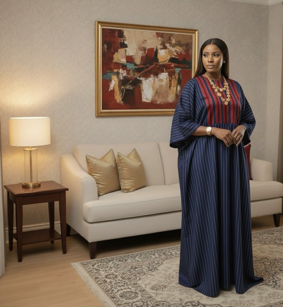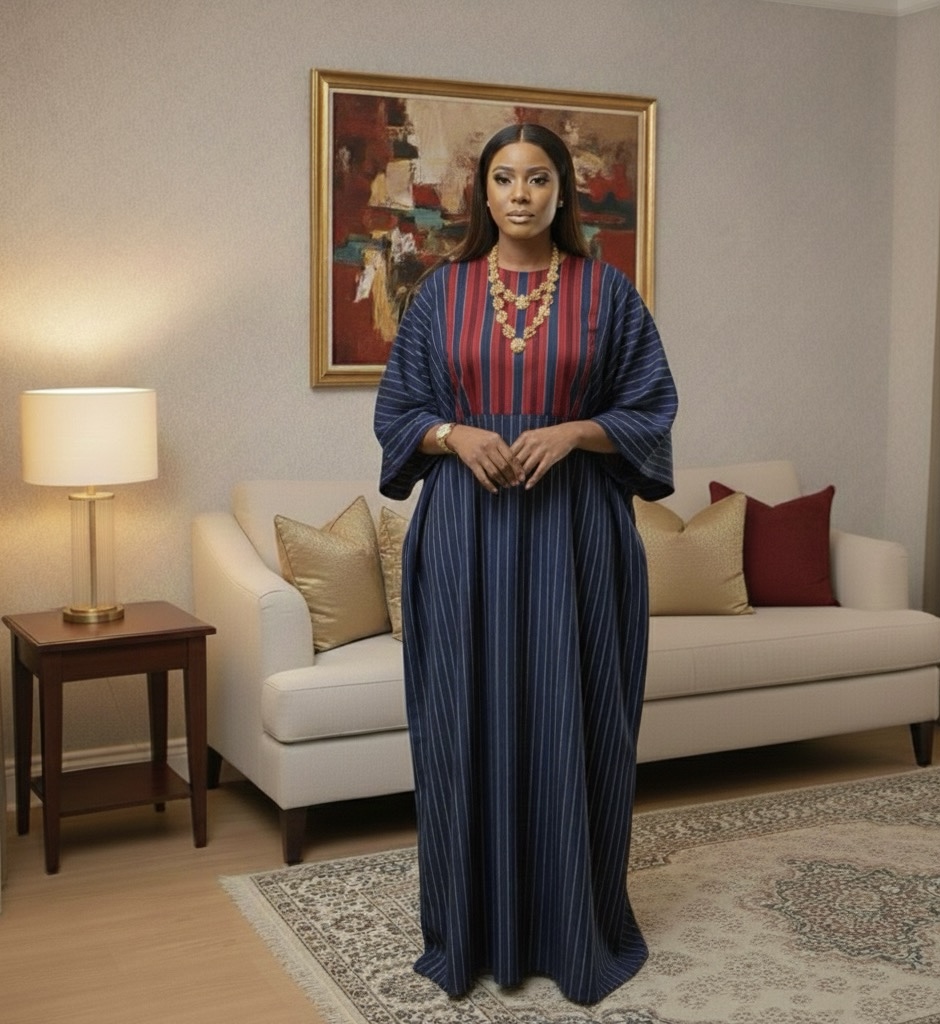 This beautifully tailored Navy Blue Striped Kaftan Dress is designed for women who love comfort, modesty, and luxury in one look. Crafted from premium soft-flow fabric, this kaftan features vertical navy stripes that create a slimming, elongating effect. The standout detail is the rich red front panel with clean vertical lines that adds a bold, stylish contrast. (Also available in other colors).