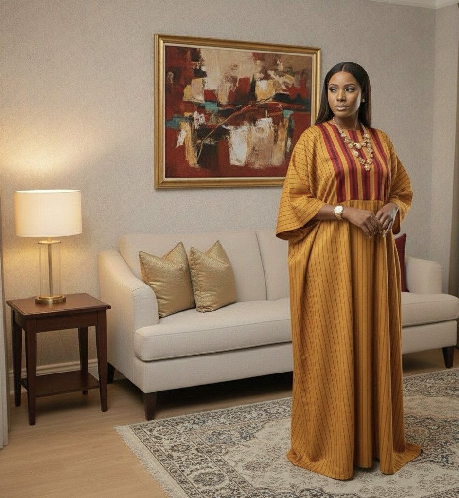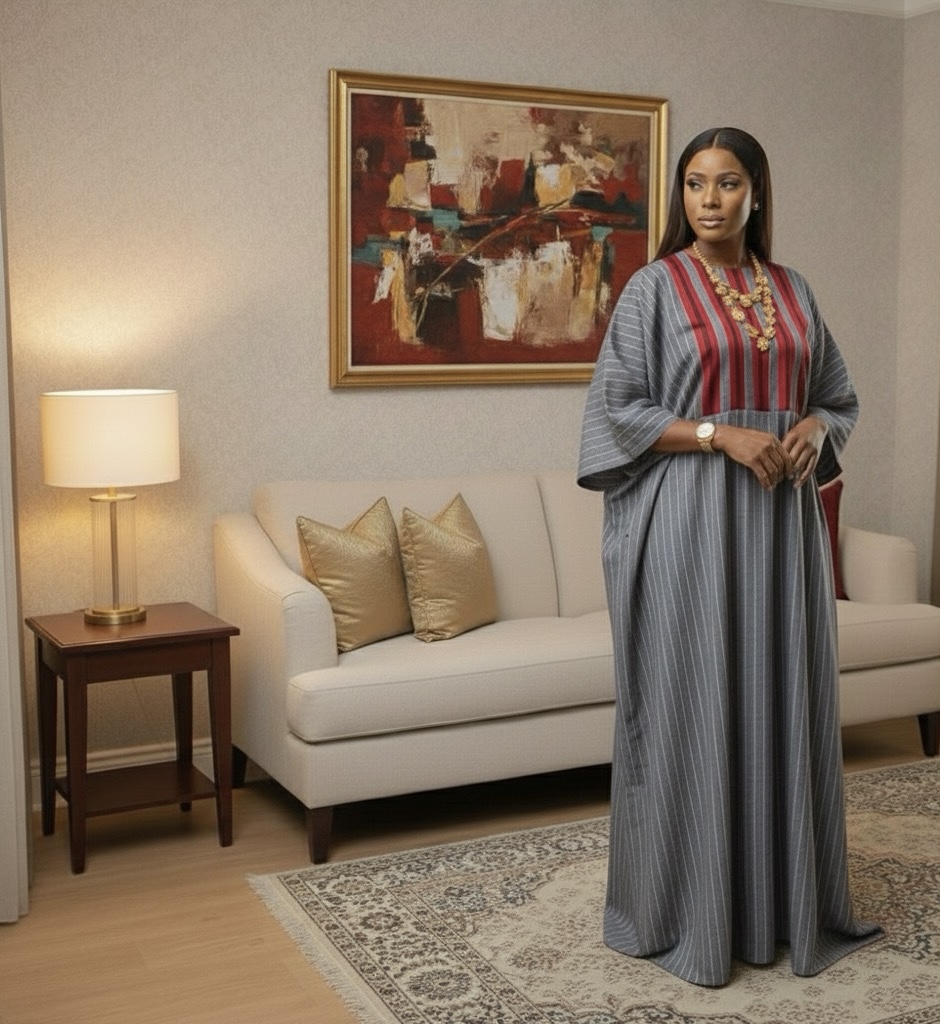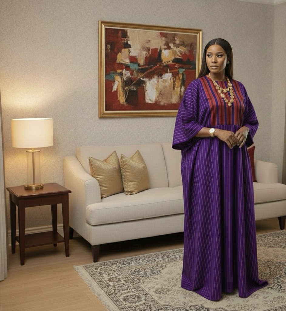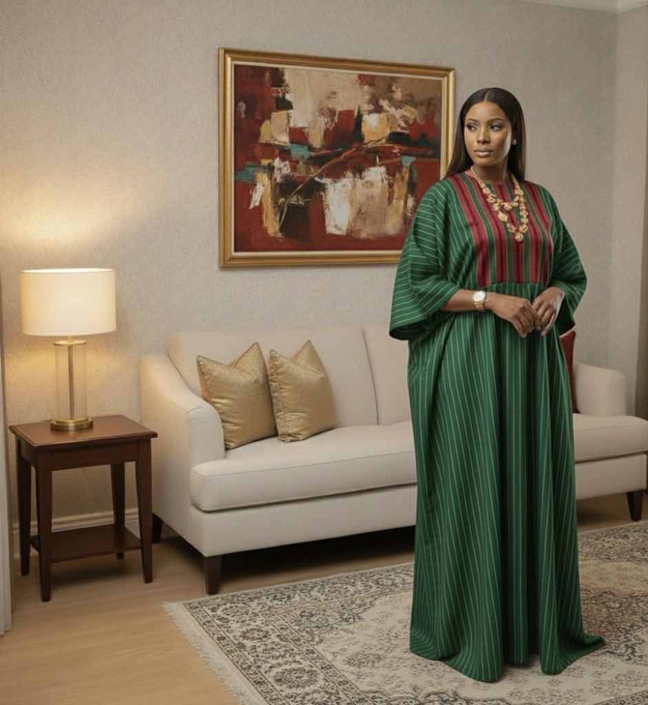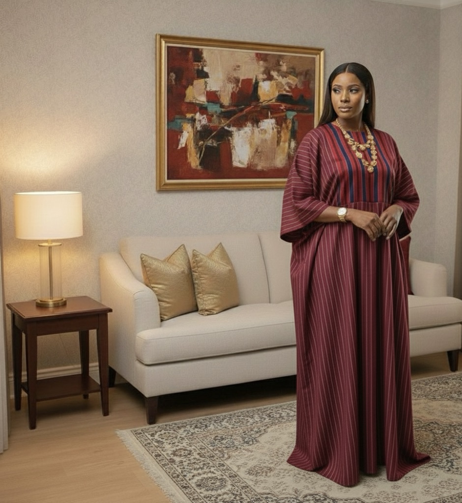 Plus-Size African Maxi Gown | Elegant Striped Kaftan Dress with Red Panel Detailings