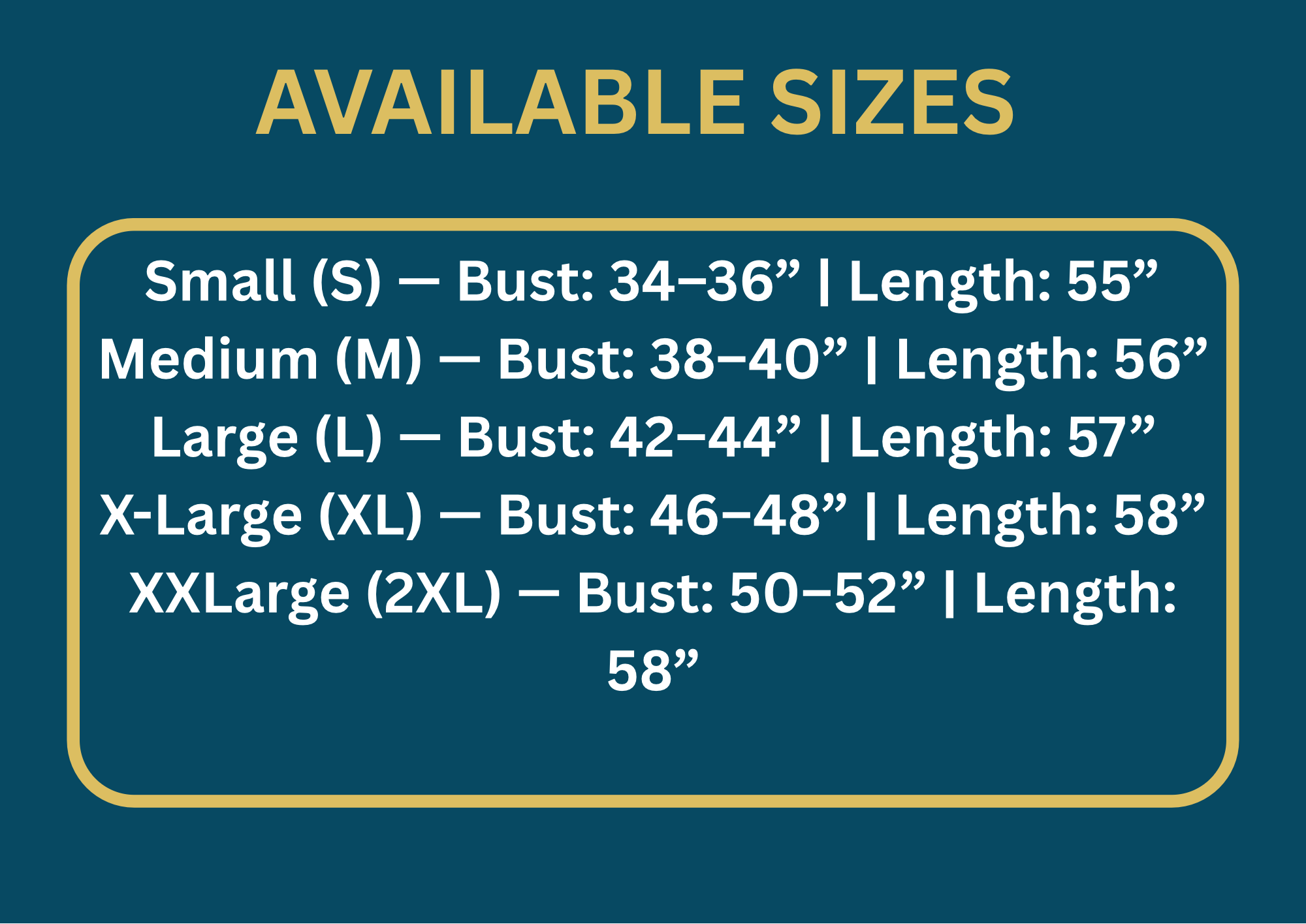 • Small (S) — Bust: 34–36” | Length: 55”